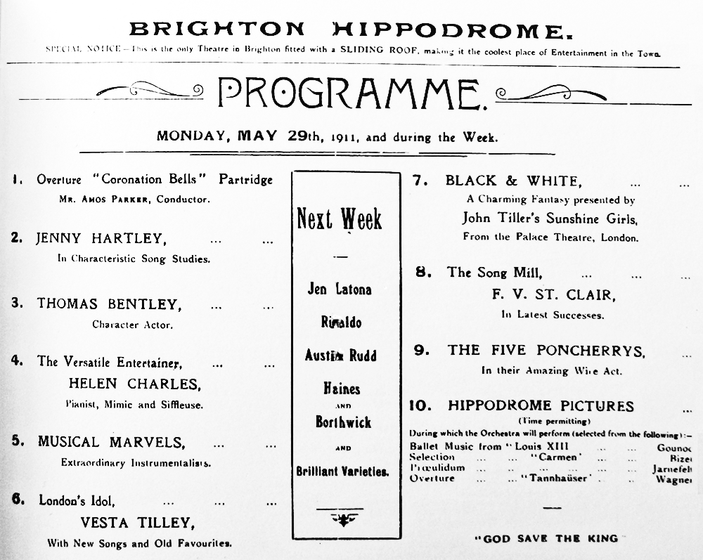 American acts were drawn to the Hippodrome in its early days. The great Harry Houdini topped the bill in the week beginning 5 December 1904. Bert Leslie, another American, described by the New York Times in 1910 as playing 'a disreputable, slang-slinging Bowry bum', went on to a successful career on Broadway. Other top Americans who appeared at the Hippodrome included Buster Keaton and Laurel and Hardy (although Stan Laurel came, of course, from Ulverston). Also on this bill, the Carina Sisters came over from the Continent. Ergotti and King Luis were a 'Risley' act, in which one acrobat lies on the stage and juggles objects such as barrels or other acrobats with his feet. Note also the inclusion of 'animated pictures of the latest subjects'—a selection of short films had a regular spot in the show.![]() This programme from 1911 still has films ('Hippodrome Pictures') with orchestral accompaniment as the last item ('time permitting') but also includes John Tiller's Sunshine Girls—yes, that's the Tiller Girls, best remembered for their weekly appearances on ITV's Sunday Night at the London Palladium from 1955 to 1967. Top act was male impersonator Vesta Tilley, whose husband, Walter de Frece, was now the owner of the Hippodrome. |